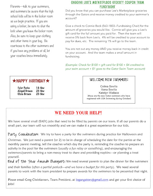 The Gators will hold an intrasquad meet next Friday, September 21, during practice time. Please email your entries to Trish at logangators(at)gmail.com. She will just need to know your swimmer's name and the event #s they want to swim. Notes will go home with swimmers starting tomorrow for this meet. Your coach may suggest some events for you so wait to see that. ALL entries are due back to Trish by Wednesday night.